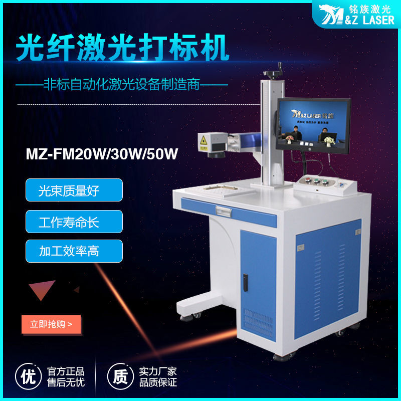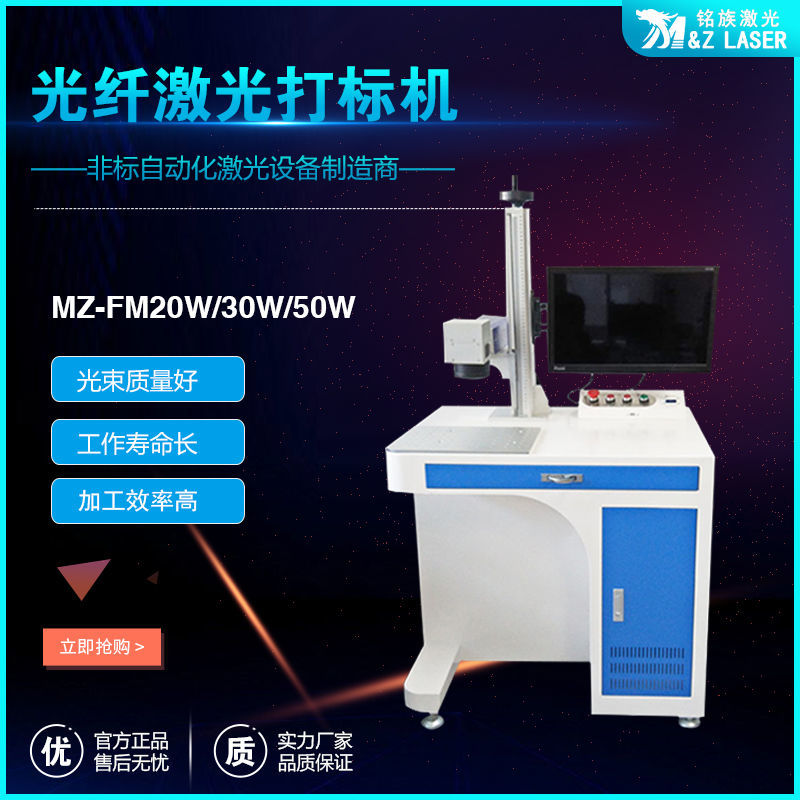 MZ-FM-20/30/50/100W-R光纖激光打標機是我公司運用現今世界上先進的激光技術研制而成的新一代激光打標機系統(tǒng)。采用武漢銳光纖輸出激光,再經高速掃描振鏡系統(tǒng)實現打標功能。光纖激光打標機電光轉換效率高,達到30%以上,采用風冷方式冷卻,整機體積小巧,輸出光束質量好,可靠性高??傻窨探饘俨牧虾筒糠址墙饘俨牧?,主要應用于對深度、光滑度、精細度要求較高的領域,如鐘表、首飾、模具行業(yè),位圖打標等。